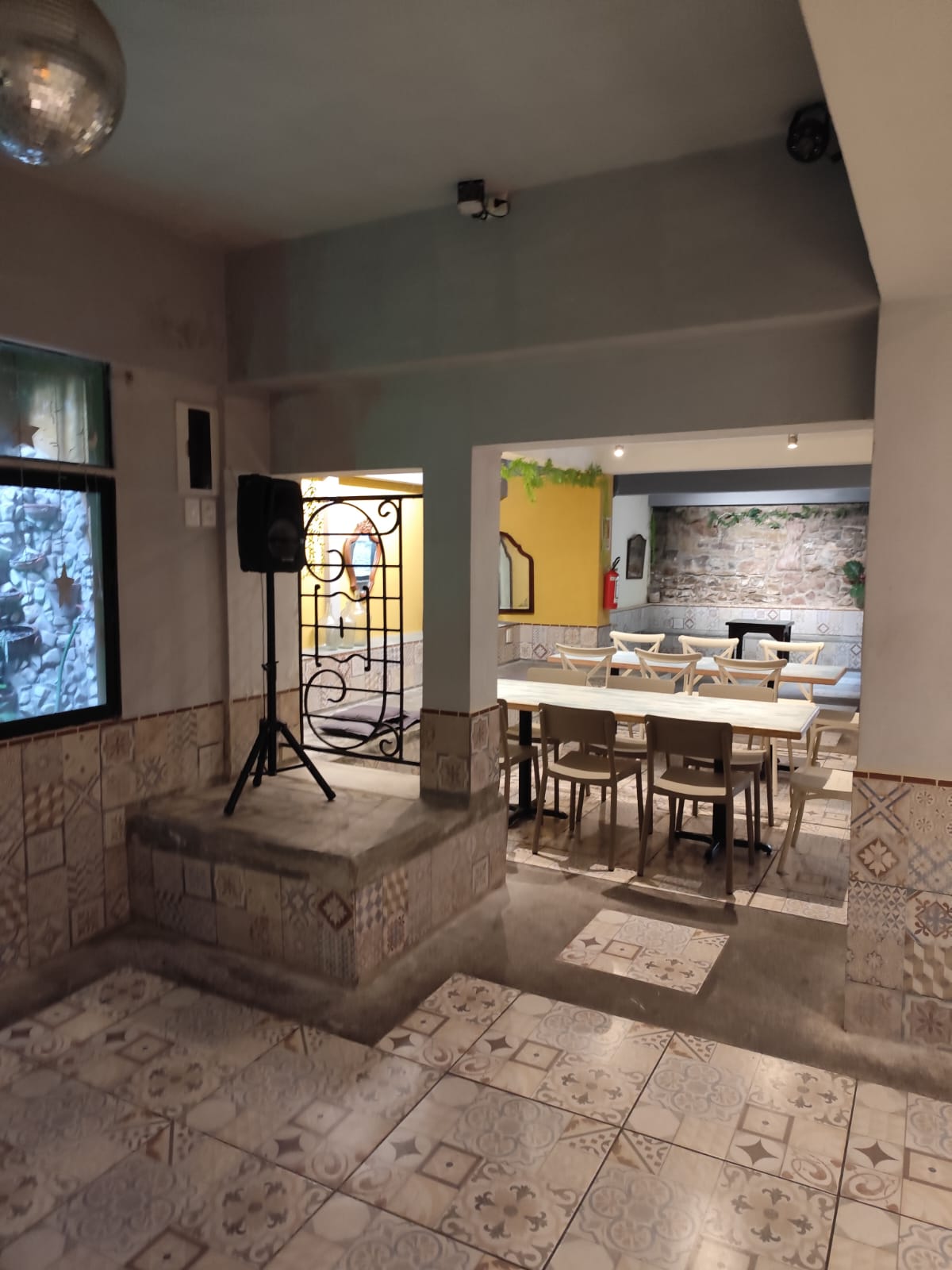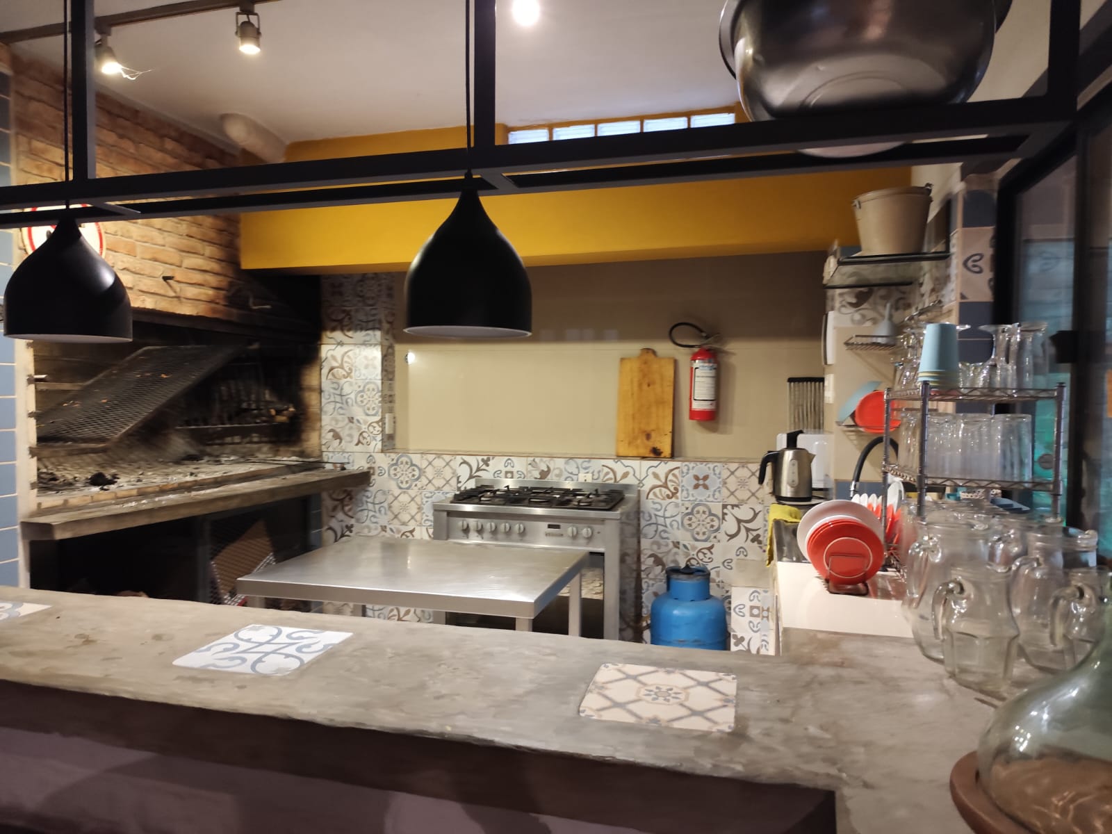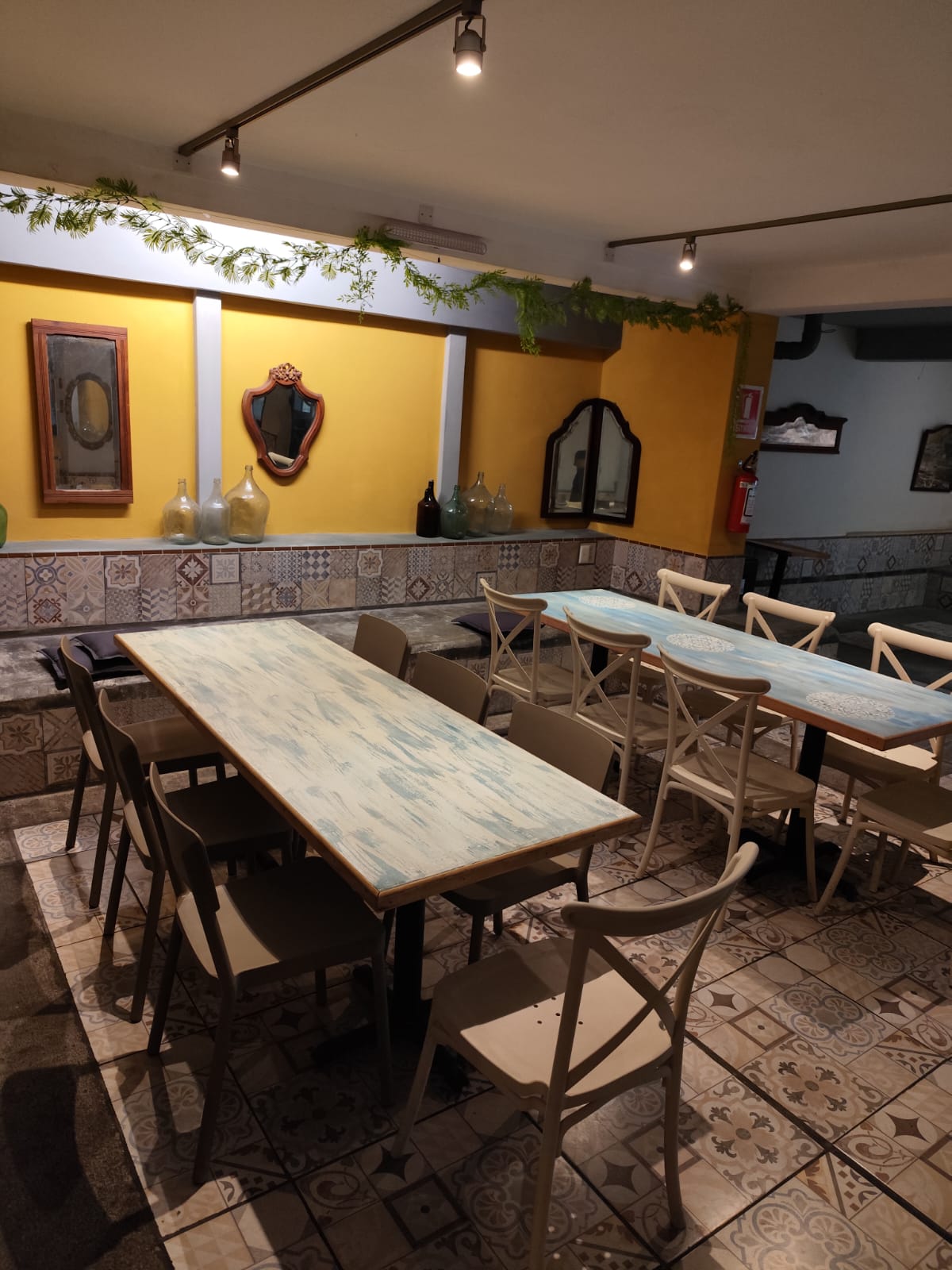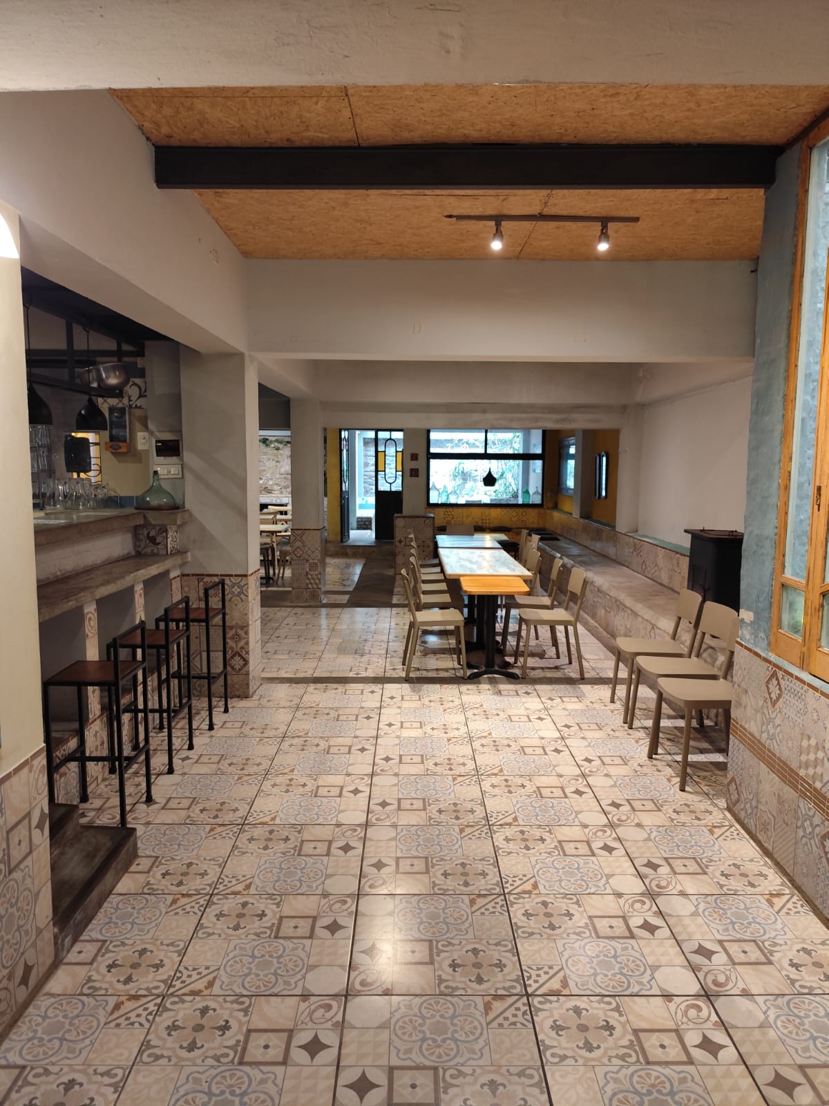 Local ambientado en un estilo español, con detalles únicos en pisos y mesadas, aportando un carácter distintivo al espacio.