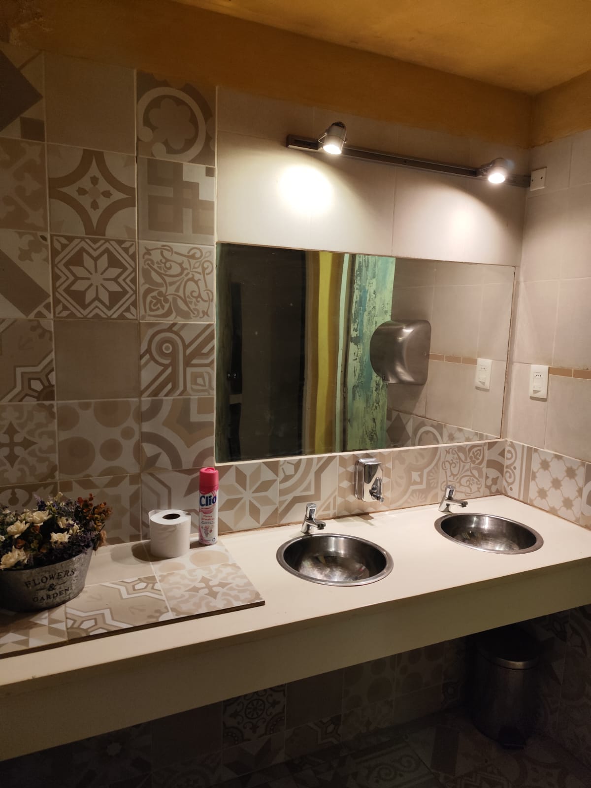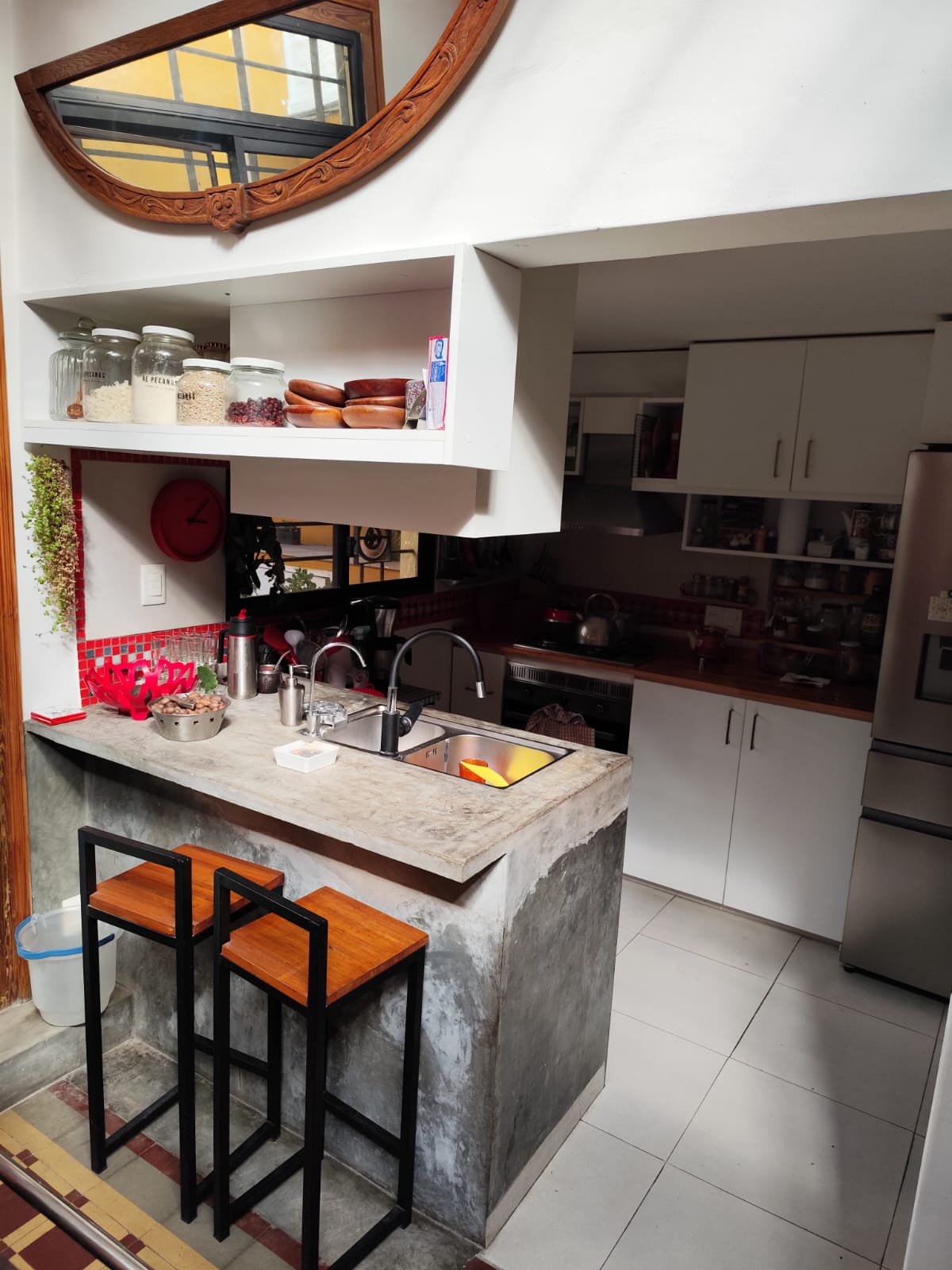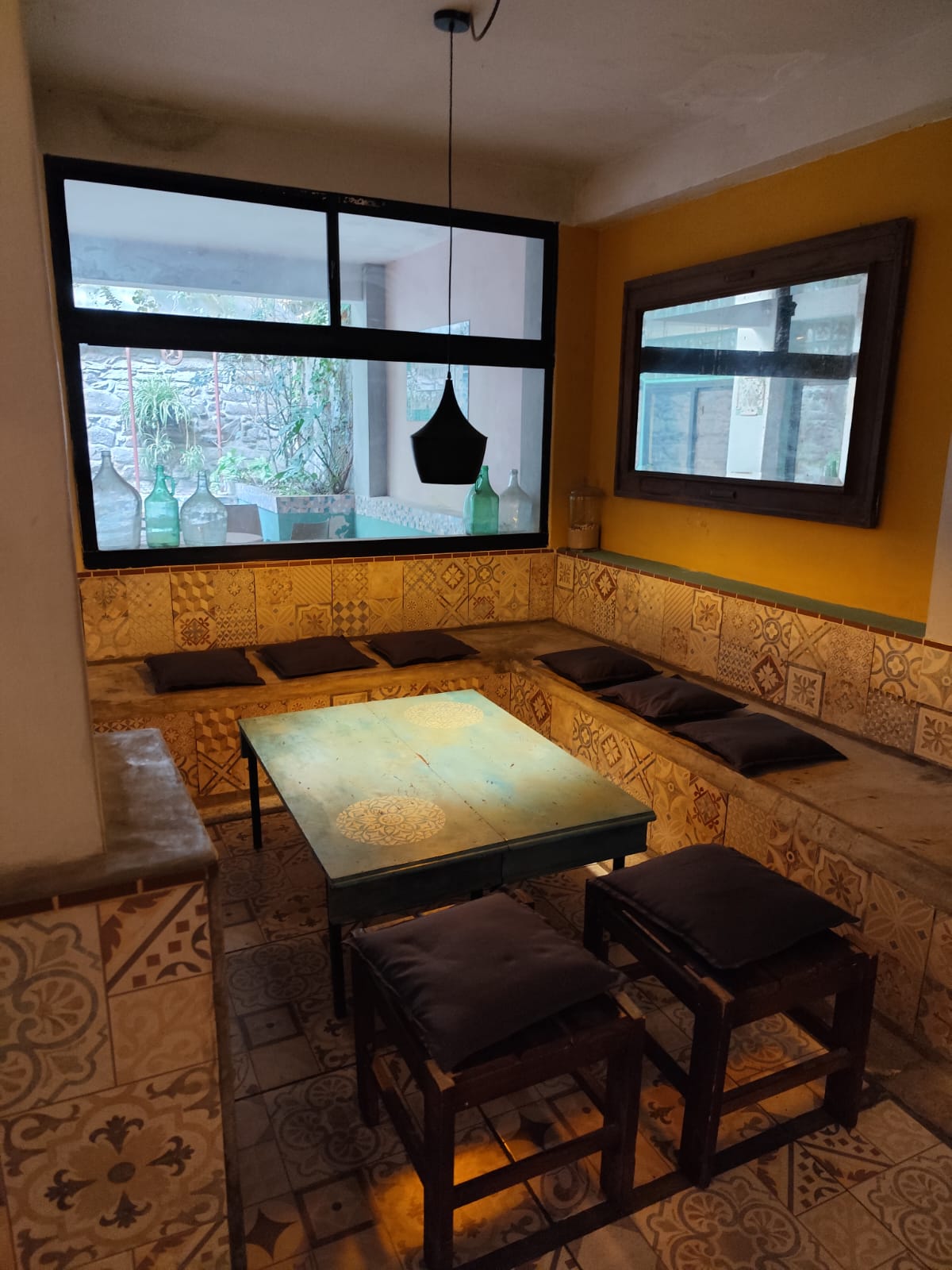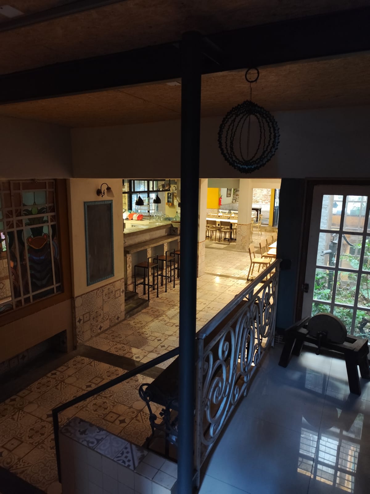 Local ambientado en un estilo español, con detalles únicos en pisos y mesadas, aportando un carácter distintivo al espacio.