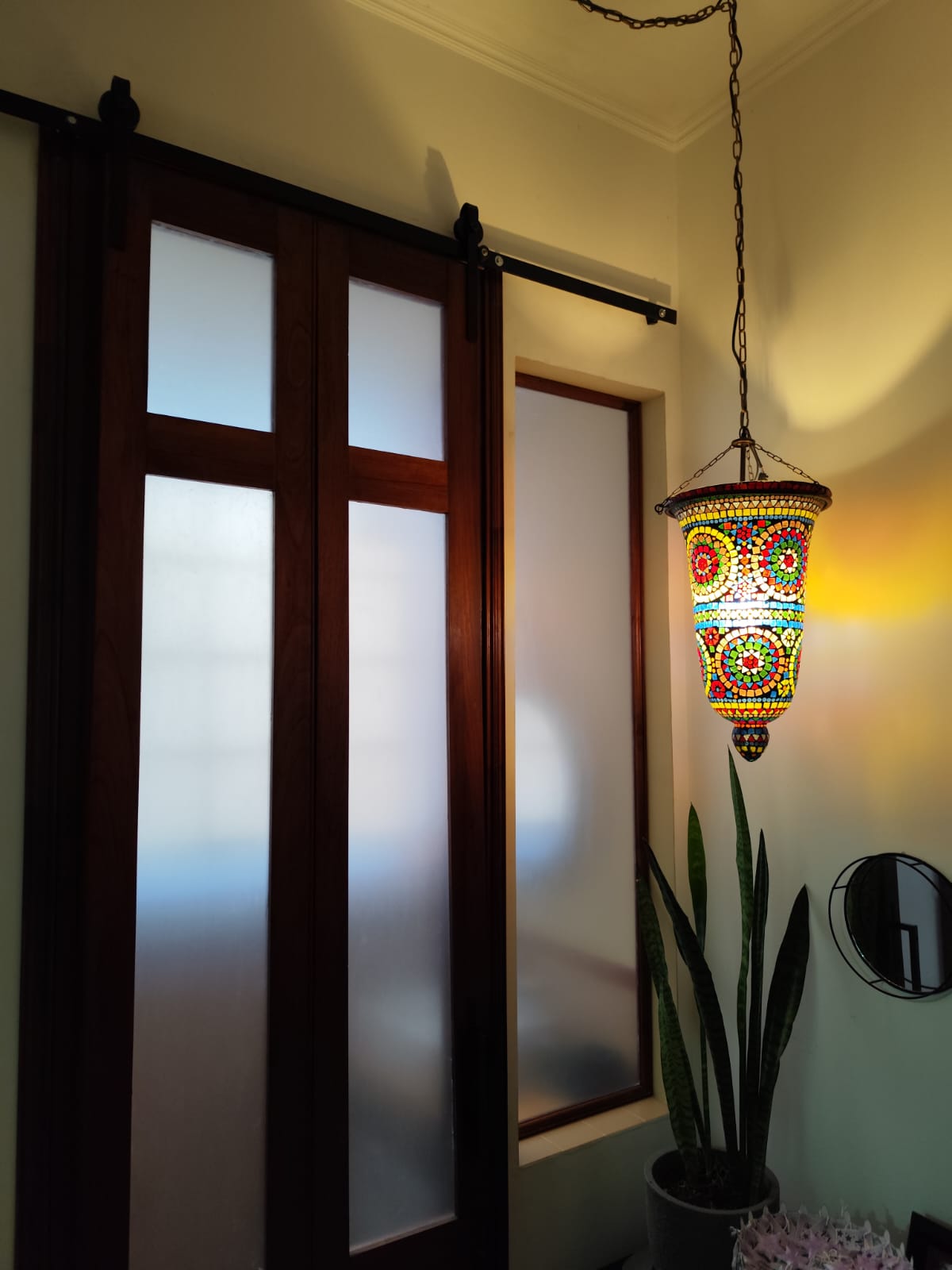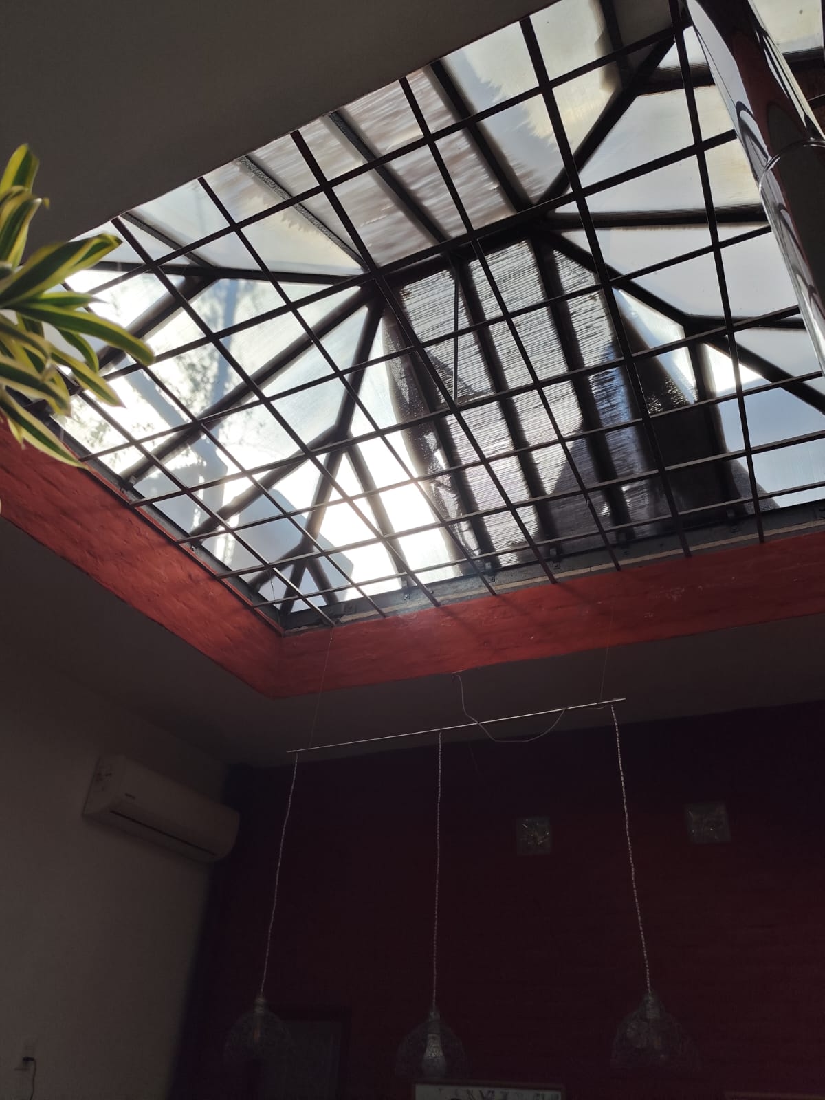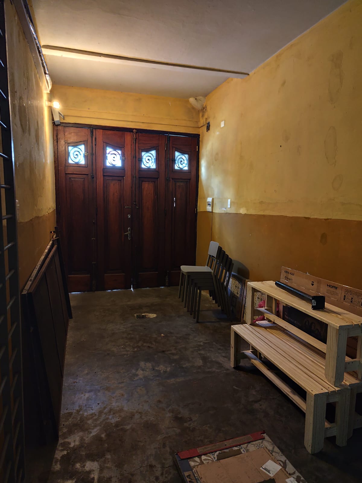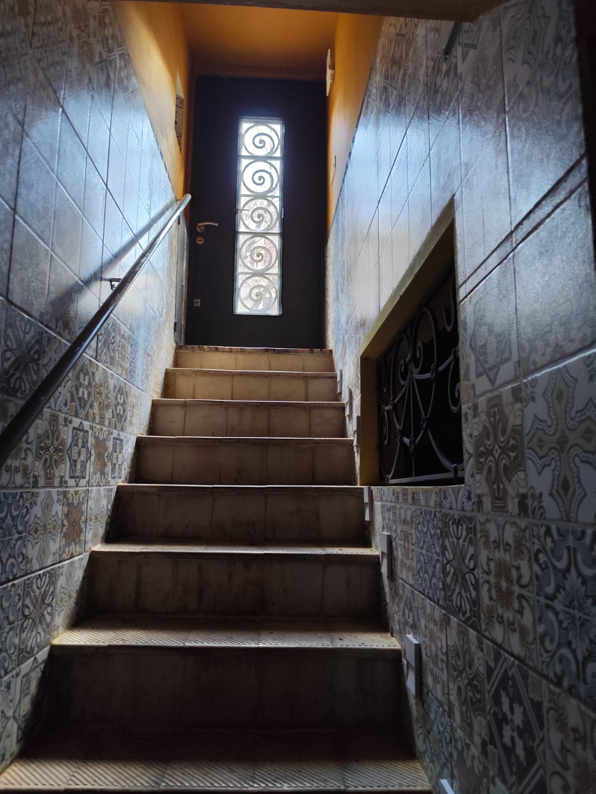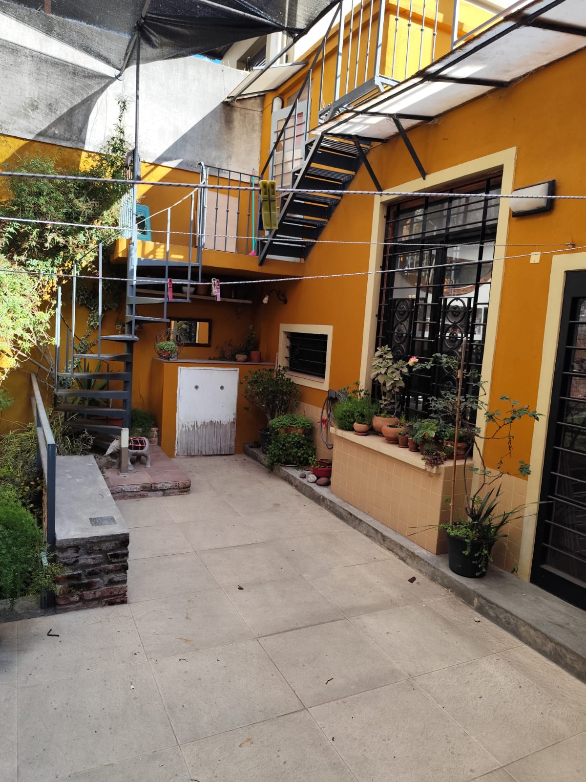 Acceso al patio exterior a través de una puerta de hierro y vidrio de doble hoja. Este patio conecta al lavadero y a una escalera que sube a la gran terraza.
