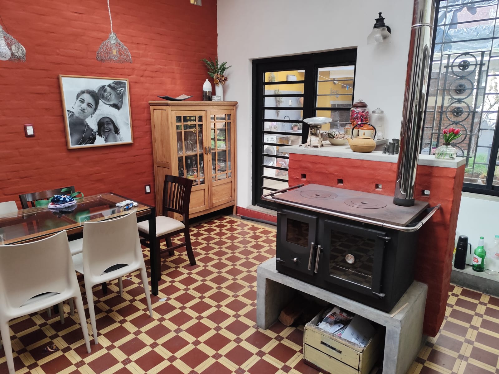 Al final del pasillo, un desnivel que da paso a una amplia cocina-comedor con estufa de hierro moderna que divide el espacio. A la izquierda, el comedor y, a la derecha, la cocina con mesada y desayunador.